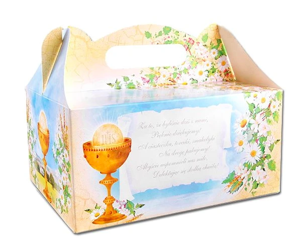 Ozdobne pudełka na ciasto komunijne z papieru z kolorowym nadrukiem i wierszykiem.