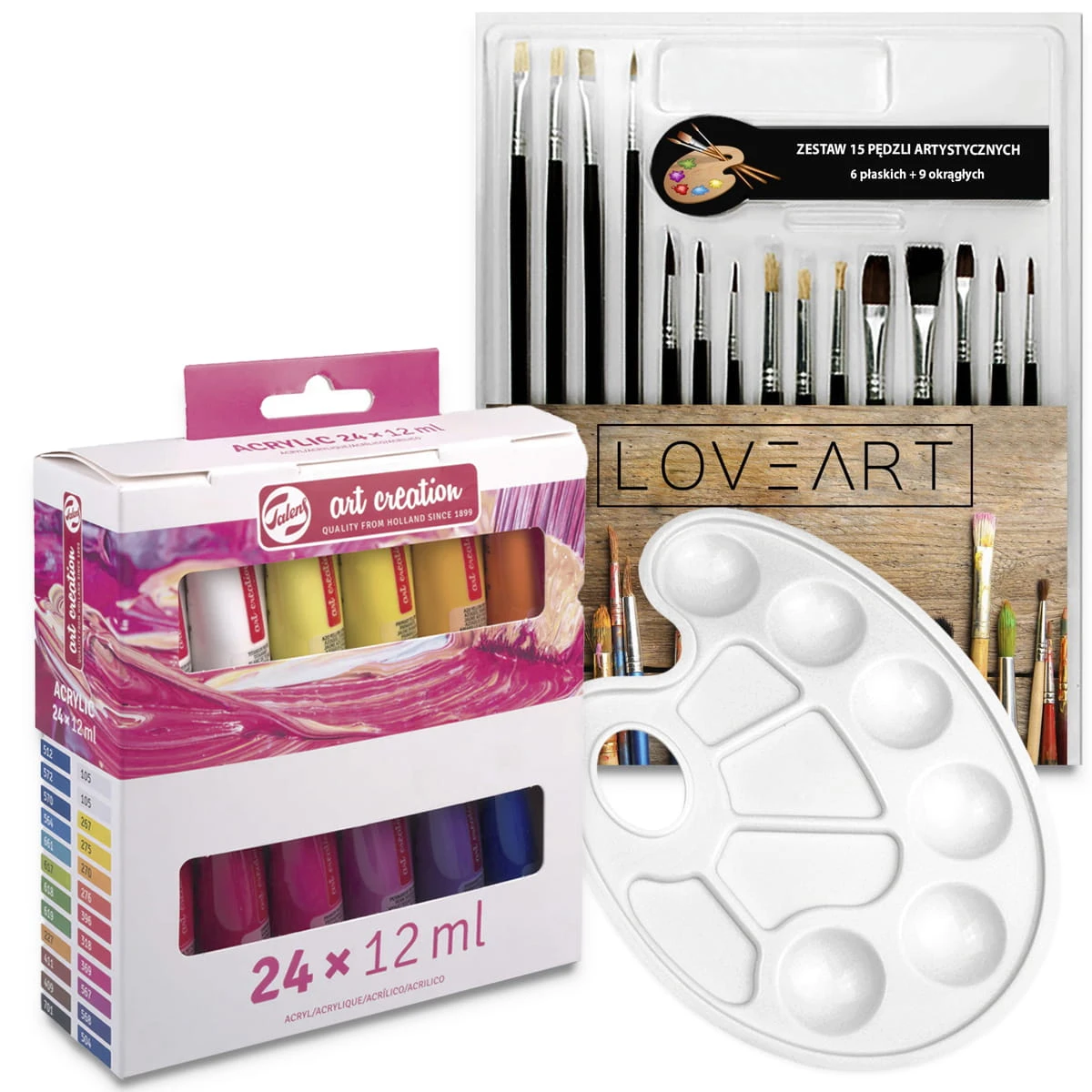 Zestaw malarski - farby akrylowe Talens 24x12 ml, 15 pędzli, paletka