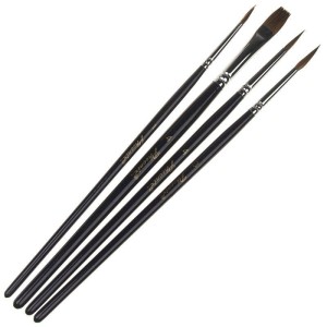 Rodzaje i rozmiary pędzli: płaski (flat) nr 4, okrągły nr 1 i 4, okrągły szpiczasty (liner) nr 3