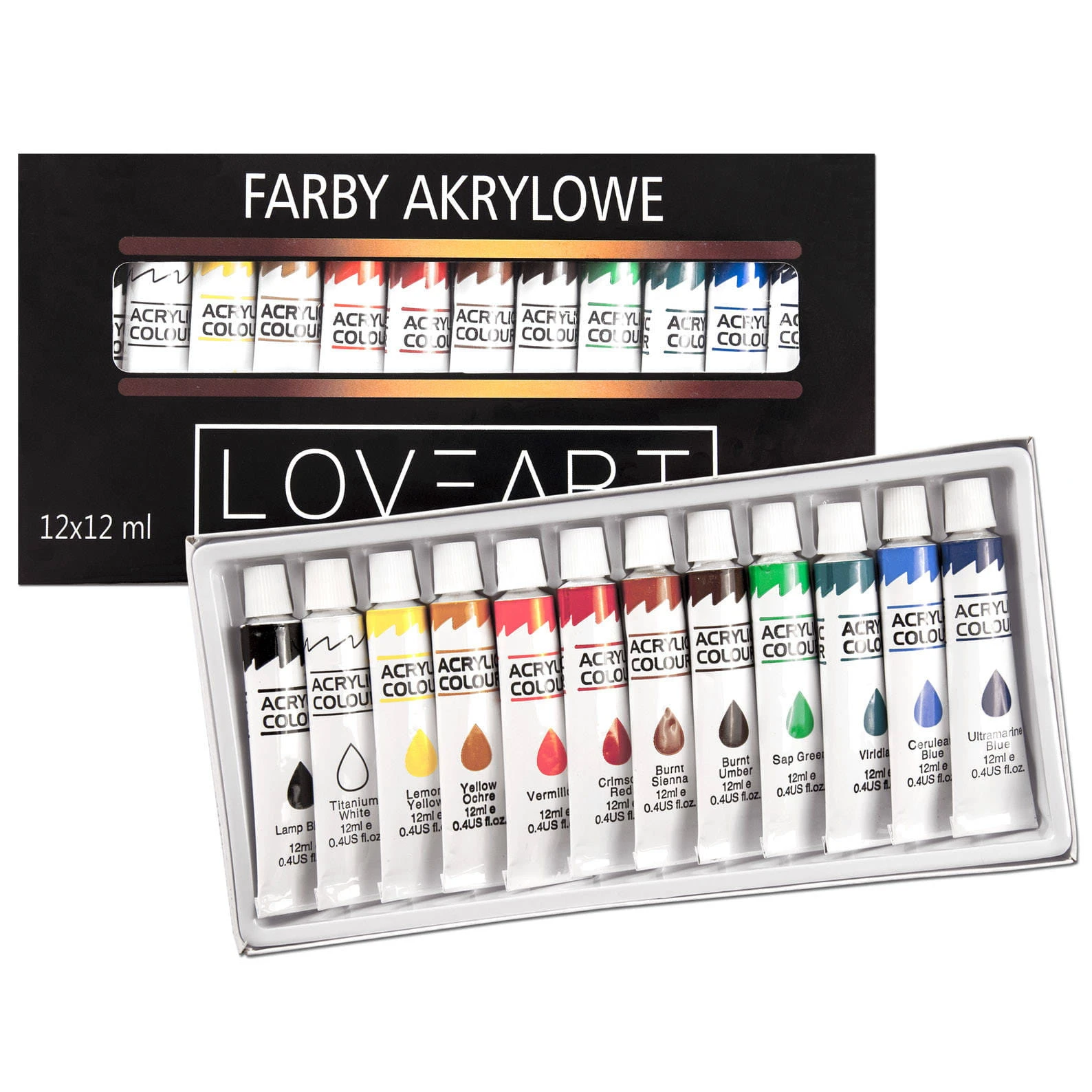 3. Zestaw farb akrylowych firmy Loveart o pojemności 12ml.